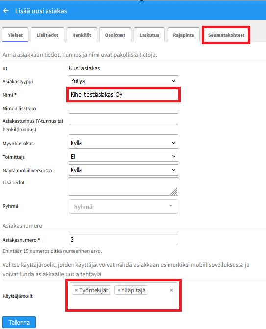 - Ennen asiakkaan tallentamista voit luoda asiakkaalle seurantakohteet siirtymällä välilehdelle Seurantakohteet.