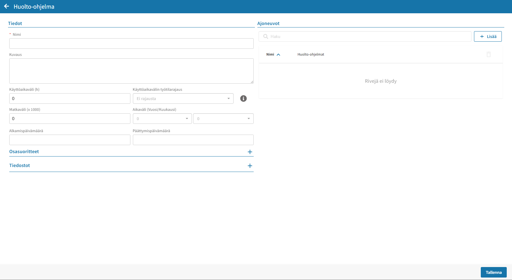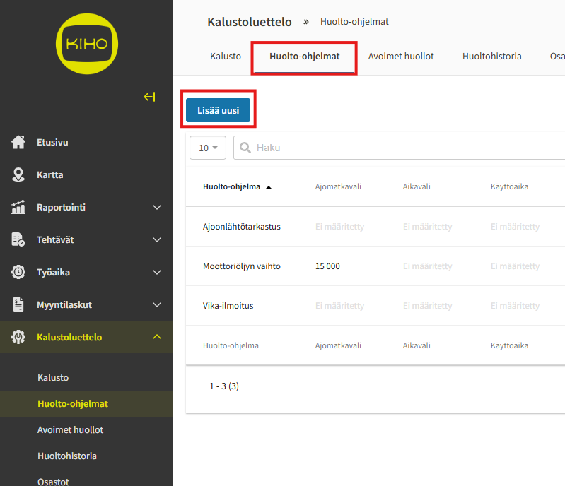 Saat luotua uuden huolto-ohjelman lisää uusi -painikkeesta.