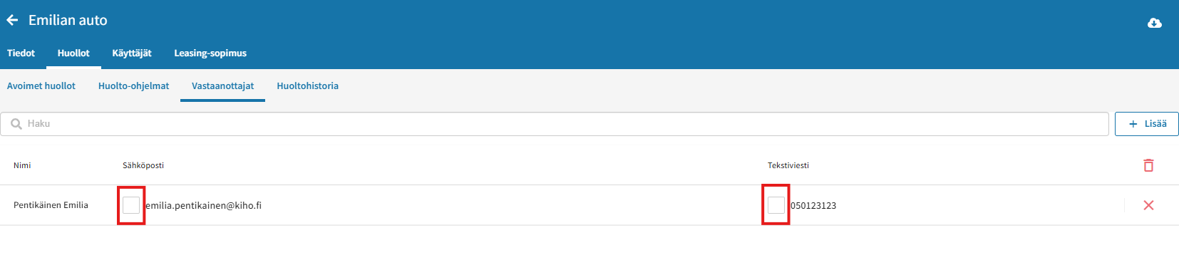 Mikäli haluat, että tulevista huolloista tai vika-ilmoituksista tulee ilmoitus, voit lisätä kalustokohtaisesti huoltoilmoituksen vastaanottajan.