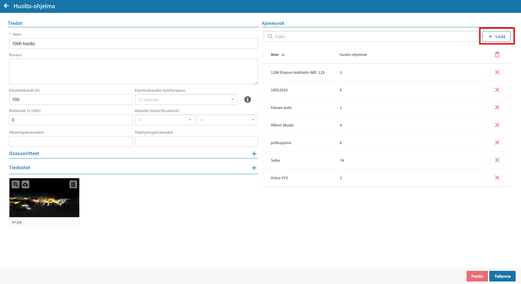 Voit lisätä kalustoille olemassa olevia huolto-ohjelmia klikkaamalla haluamaasi huolto-ohjelmaa ja valitsemalla kaluston ajoneuvot -valikosta.