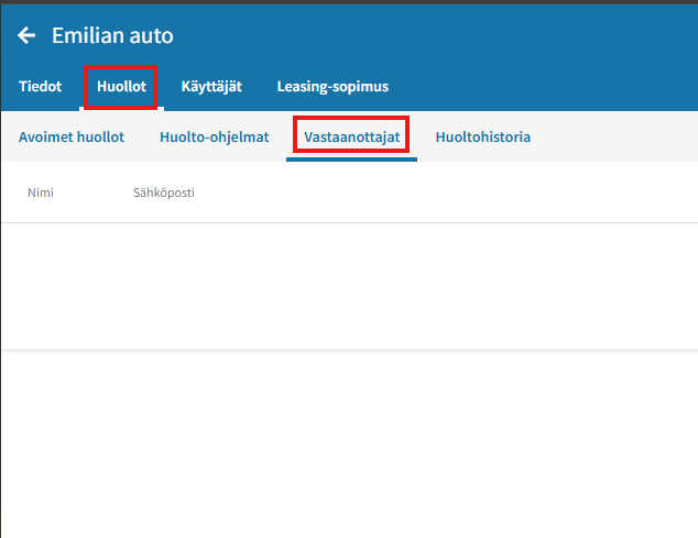 Siirry välilehdelle huollot ja klikkaa vastaanottajat.