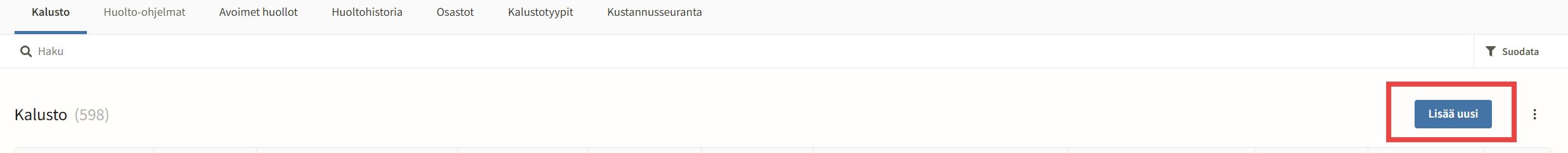 Luodaksesi uuden kalustokortin, klikkaa lisää uusi -painiketta kalustoluettelolta.
