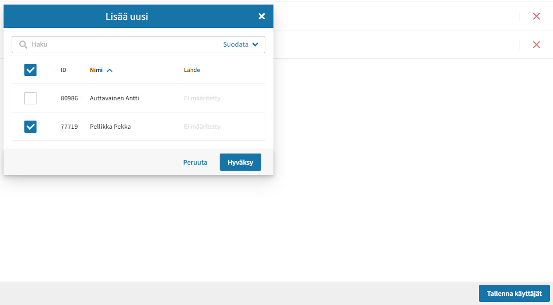 Valitse haluamasi käyttäjät listalta klikkaamalla käyttäjän kohdalla olevaa tyhjää laatikkoa. Klikkaa lopuksi hyväksy.