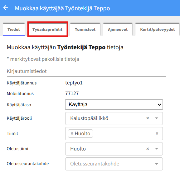 Mikäli yrityksessä on Kihon työaika-palvelu käytössä, voit asettaa uuden käyttäjän työaikaprofiiliin käyttäjätunnuksen luomisen jälkeen käyttäjän tiedoista välilehdeltä työaikaprofiilit.
