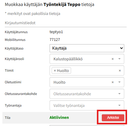 Tunnusten arkistointi tapahtuu käyttäjähallinnasta. Klikkaa taulukosta sen käyttäjän nimeä, jonka haluat arkistoida. Klikkaa käyttäjätiedoista arkistoi.