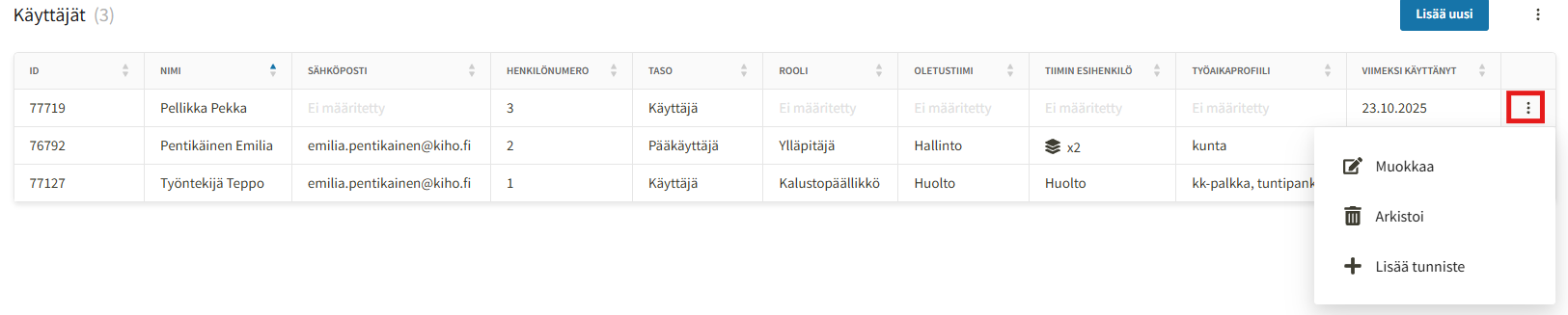 Voit arkistoida käyttäjätunnuksen käyttäjähallinnan taulukkonäkymästä klikkaamalla haluamasi käyttäjän kohdalta kolmea pistettä -> arkistoi.