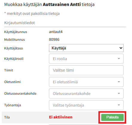 Klikkaa taulukosta sen käyttäjän nimeä, jonka käyttäjätunnuksen haluat palauttaa. Klikkaa käyttäjätiedoista palauta.