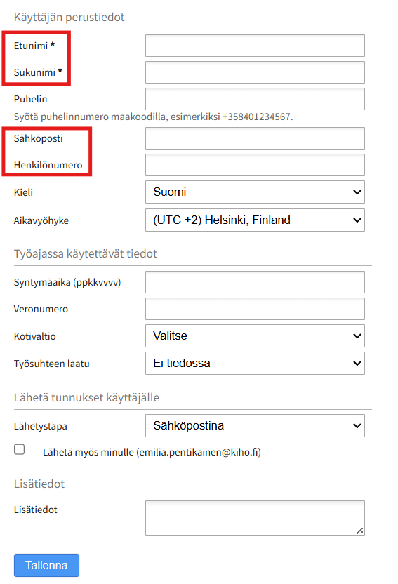 - Käyttäjälle täydennetään halutut tiedot, pakollisina tietoina ovat etu- ja sukunimi.