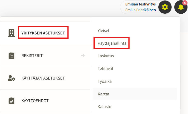 Klikkaa oikeasta yläkulmasta rattaan kuvaa ja valitse Yrityksen asetukset -> Käyttäjähallinta.