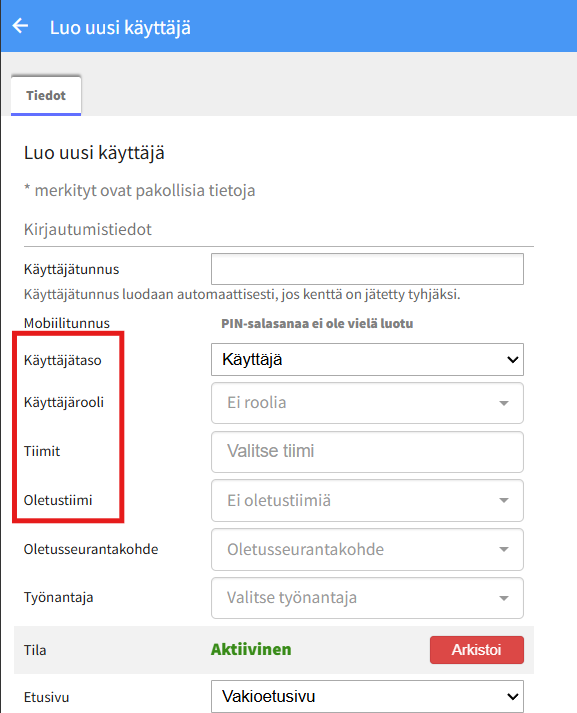 - Jos on käytössä jokin työaikarajapinta, käyttäjälle asetetaan henkilönumeroksi ulkoisessa järjestelmässä oleva henkilönumero/palkansaajanumero (esim. 1).