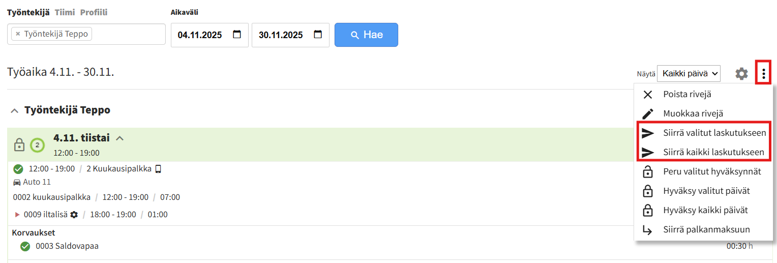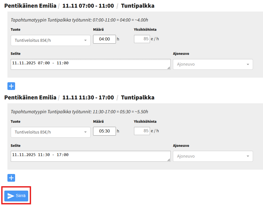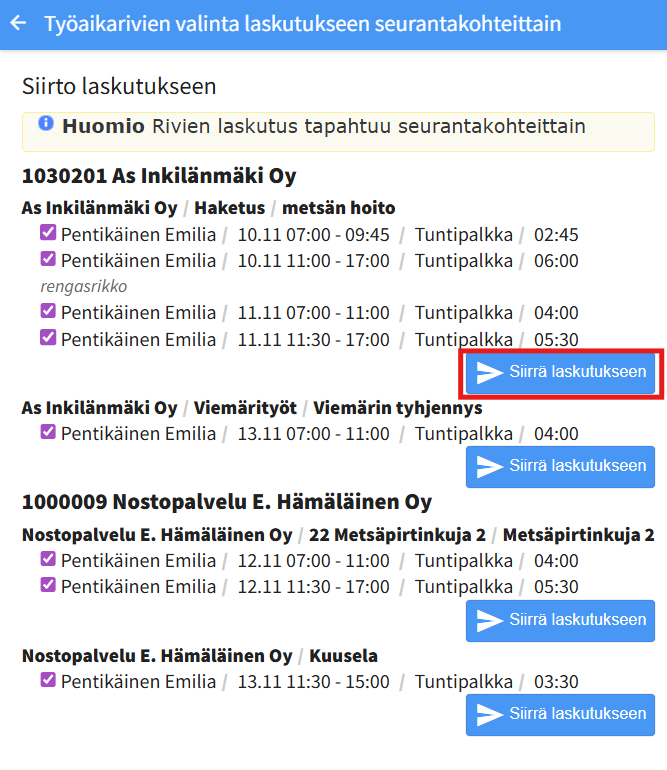 - Siirrä valitut laskutukseen, voit itse valita, mistä työaikariveistä muodostat laskurivejä.