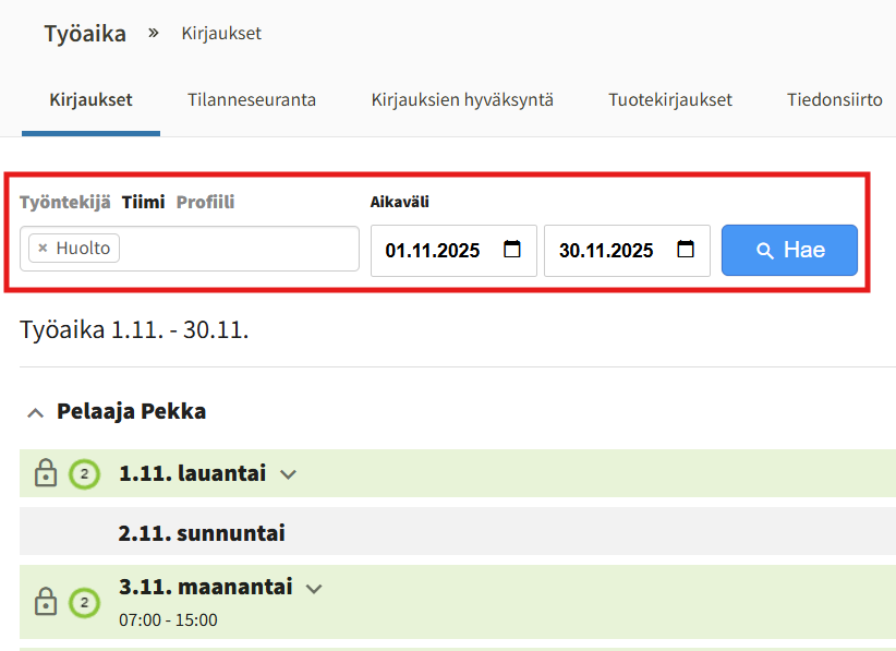 Valitse minkä aikavälin työaikakirjauksista haluat muodostaa laskurivejä, sekä työntekijä, tiimi tai profiili, joiden työaikakirjauksista haluat muodostaa laskurivejä.