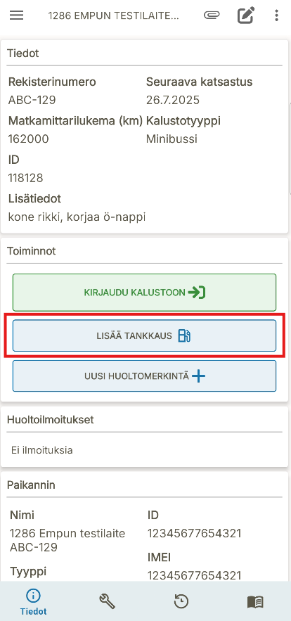 Paina kaluston tiedoista Lisää tankkaus-painiketta.