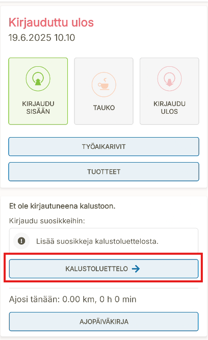 Paina Kiho-sovelluksen etusivulta Kalustoluettelo-painiketta.