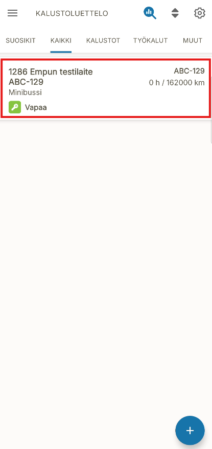 Valitse kalusto, jolle haluat lisätä tankkauksen klikkaamalla kalustoa.