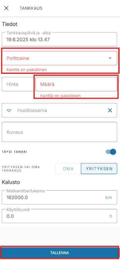 Ohjeistus tankkauksen lisäämisestä kun et ole kirjautunut kalustoon